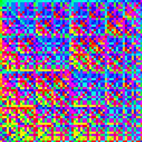 Real and imaginary coefficients in 720 concatenated Kronecker products of six permuted unitary operators. Summation over these products gives an 64 by 64 matrix depicted by hues of arg. [wip-id: quokronfold21perm6qrd1020…