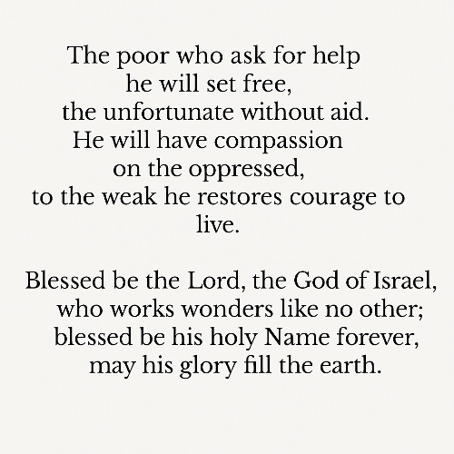 The poor who ask for help he will set free,the unfortunate without aid.He will have compassion on the oppressed,to the weak he restores courage to live.Blessed be the Lord, the God of Israel,who works wonders like n…