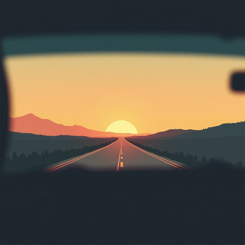 A minimalist lo-fi jazz poster in soft muted colors. View from inside a car, windshield framing a dreamy open road at sunset. Vintage grain texture, calm atmosphere, smooth lines. No characters, just road, horizon, sky r…