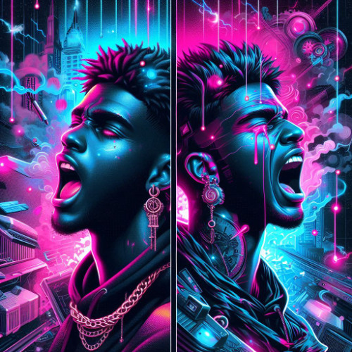 "Cover art for a trap demo with a mix of euphoria and sadness. The background should have vibrant neon colours like pink, blue, and purple, combined with darker tones to create a contrast between energy and melancholy. T…