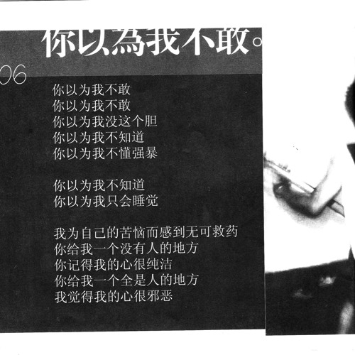 你以为我不敢 你以为我不敢你以为我没这个胆你以为我不知道你以为我不懂强暴你以为我不知道你以为我只会睡觉我为自己的苦恼而感到无可救药你给我一个没有人的地方你记得我的心很纯洁你给我一个全是人的地方我觉得我的心很邪恶