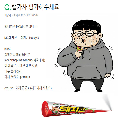 어릴 때 부터 유명했지무대에서 잘 노는 놈그래서 돼지콘이 됐지될꺼야 잘 버는 놈next The Q or Beenzino부정못해난 랩과 콘의 간격을 좁힌놈 (더큐 벤틀리 가사 오마주)난 멋있게 살어비 올 때 우산없어도 품위있게 걸어멋있게 걸어싹 다 올인돼지콘 힙합에 전부를 걸어안되면 모가지 밧줄에걸어근데 그럴일 없어몇년 뒤면 내 단독공연 사람들이 모여나 눈 감으면 …
