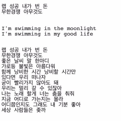 랩 성공 내가 번 돈무한경쟁 아무것도좋은 날씨 말 한마디 가로등 불빛은 아름다워 함께 낭비한 시간 낭비할 시간만 있다면 우리 떠나자 굳이 빨리 가지 않아도 돼 우리는 멀리 갈 수 있잖아나는 노래 할게 너는 춤을 춰줘 지금 어디로…